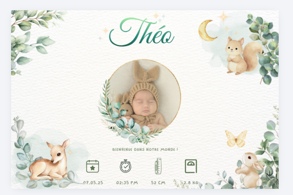 Prénom, date, poids… tout est personnalisé pour créer un souvenir précieux et rempli d’émotion.